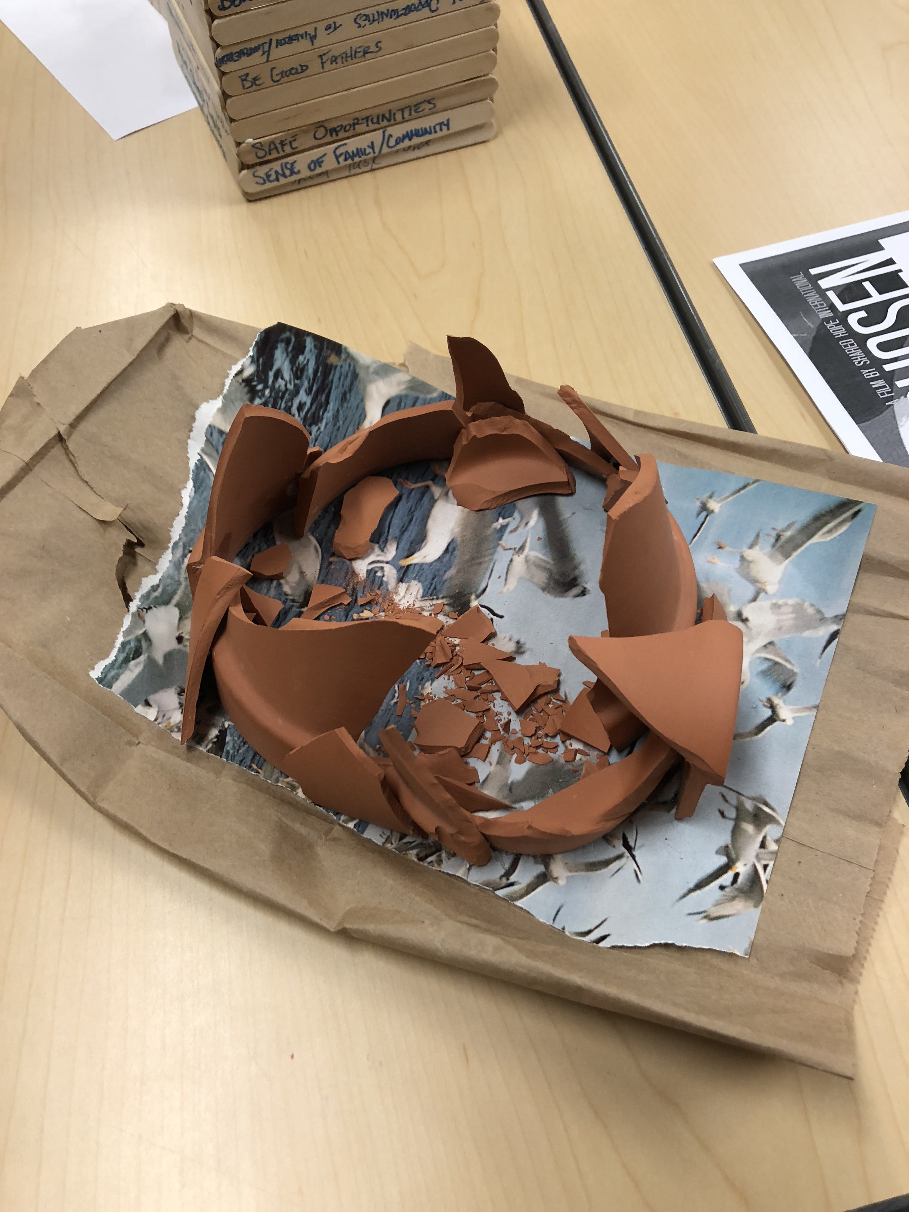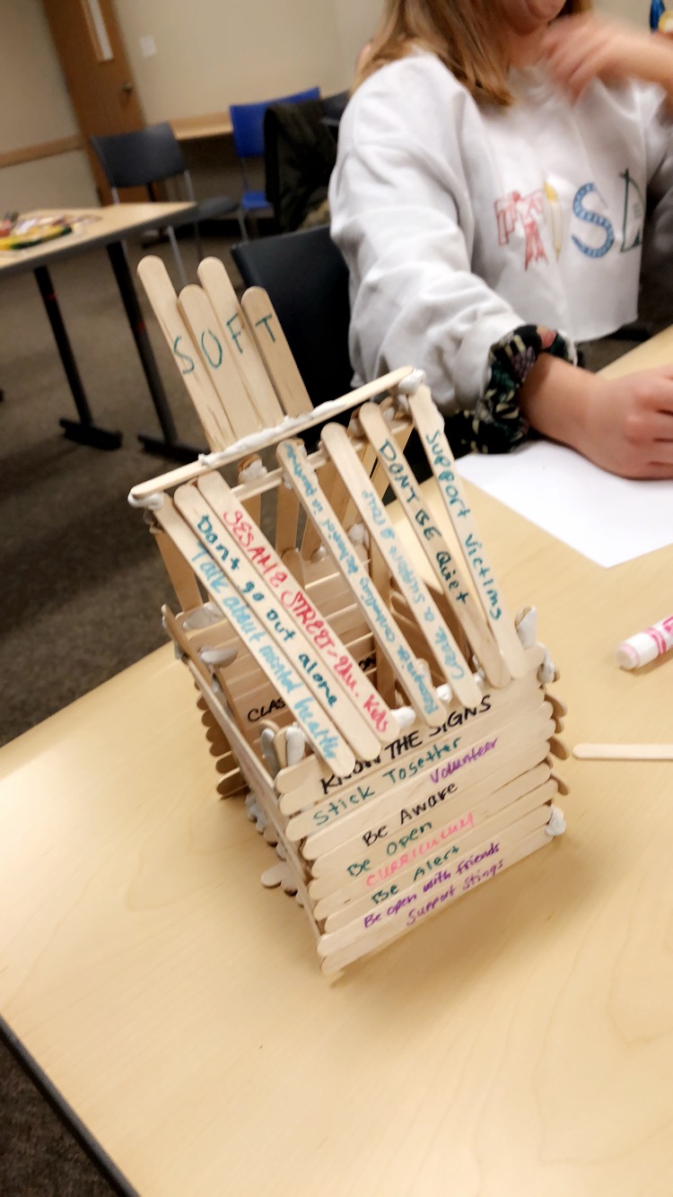 Worked with a group of students to host and implement a Charrette in our Arts Outreach and Community Engagement class. We chose the topic of human trafficking where we talked about what human trafficking was and how to prevent it. Throughout the process attendees worked on multiple art projects to help brainstorm solutions for prevention. The first project we did was have participants break a pot then use the pieces to create a new piece of art to show people that just because something may be broken, it can still be mended to create something beautiful. The second project we did was have participants get into groups to create popsicle sticks with solutions listed on them. We then put the houses together to create a “community of solutions.”